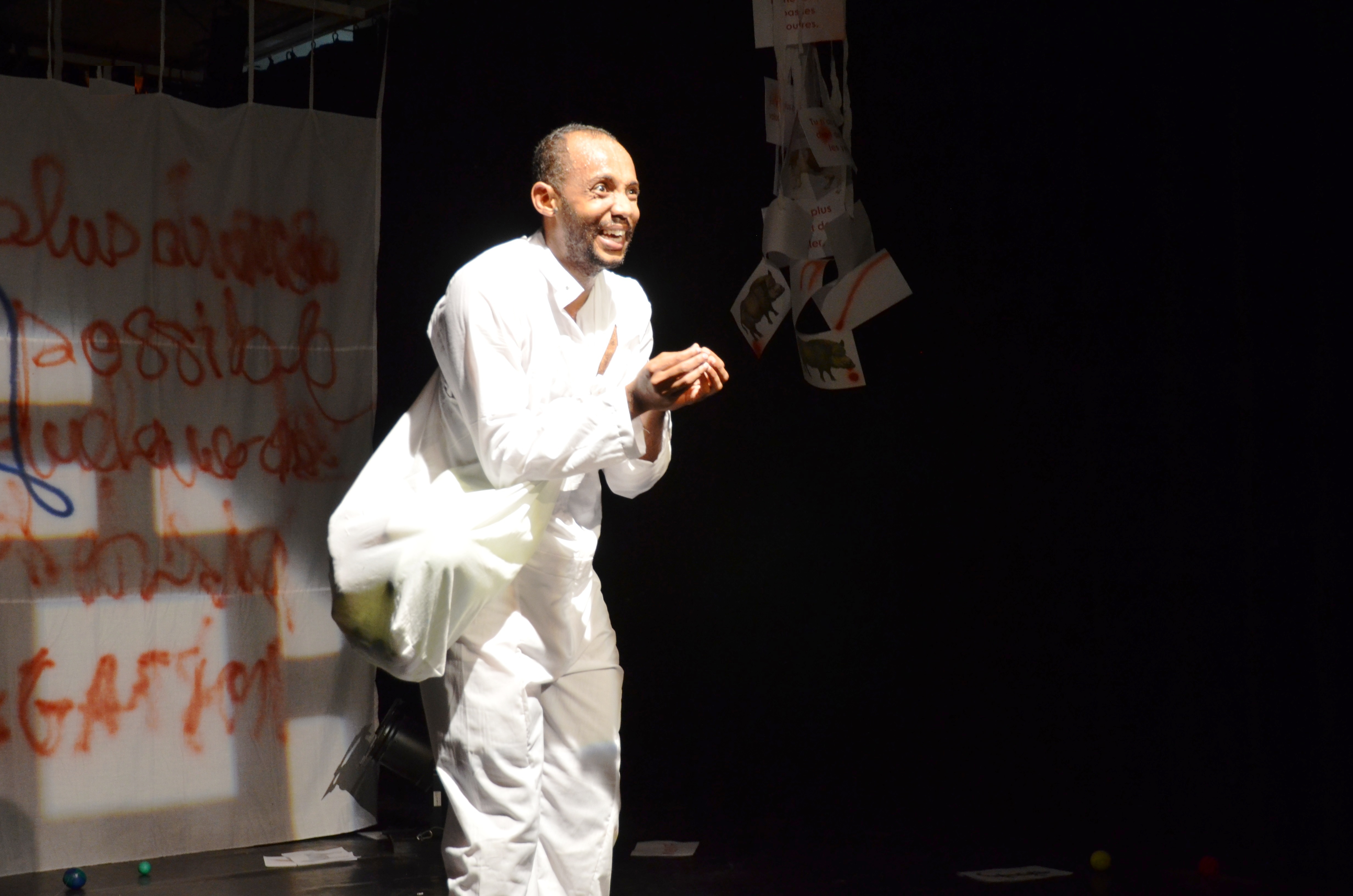 « Cela fait 30 ans que je gonfle comme ça, nous dit le comédien, et je me demande quand même s’il n’y a pas de fuite », un clin d’œil peut-être au destin de son pays qui se débat dans un réel complexe pour devenir une nation à la hauteur de ces enfants. Quand on connait un peu intimement l’histoire de ce comédien, on est pris d’émotion vu la qualité et la justesse de son jeu. Car il est vrai qu’il est parti de loin. Il est venu apprendre et il nous transmet son plus grand capital, l’émotion, la générosité dans le jeu, la bonne humeur. Les histoires personnelles et artistiques se croisent et se répondent, car Soumette est un lutteur sans nom qui est en train de s’en donner un. On se souviendra de ce gaillard plein d’énergie, pleins de ressources. Son histoire c’est celle d’un jeune homme ambitieux mais sans le sous, qui part des Comores, pour débarquer à Avignon, avec la ferme intention « apprendre pour transmettre et puis améliorer mon travail de comédien, car avant le conservatoire, j’étais déjà comédien dans la compagnie que je dirige à Moroni ». Un combat qu’il mène au péril de sa vie. Il a faillit y laisser des plumes, mais ce sont les rencontres heureuses et malheureuses qui l’ont construit. C’est aussi sa force de caractère qui l’a maintenu debout, qui l’a mené à son objectif. Après avoir été diplômé du Conservatoire, il vient de recevoir le prix du meilleur comédien, du « Grand Prix Afrique théâtre francophone 2014 », du Prix Bernard Giraudeau 2015, ainsi que du Prix Passe-Portes 2015. Dans sa valise, Soumette est venu au festival d’Avignon en 2015 avec ses meilleurs soutiens, les artistes peintre Seda et Gamil qui exposent leurs toiles dans le hall du Conservatoire. Et pour couronner le tout, il a le soutien de l’un des musiciens le plus en vue dans l’archipel comorien, Maalesh qui joue prochainement au Conservatoire du Grand Avignon le 24 juillet après le spectacle « Je n’ai pas de nom ». 2015, est ainsi devenu synonyme de l’année des Comores en France. Les Comores redonnent ainsi un grand nom à l’un de ses plus grand fils, Soumette Ahmed. Un spectacle salué par toute la presse régionale comme Vaucluse Matin : « Ahmed Soumette maîtrise la poésie de Tarkos certes, mais propose surtout une surprenante «mise sur le plateau» du poète Marseillais, le tout délicatement enrobé d’un rire salvateur ». Un grand succès pour une première dans le OFF.